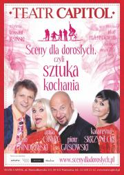 Spektakl to przezabawna komedia na czterech aktorów (Katarzyna Skrzynecka, Piotr Gąsowski, Anna Oberc oraz Jakub Przebindowski), w której sceny przeplatane są piosenkami i żywą interakcją z widzami. "Sceny dla dorosłych, czyli sztuka kochania" w reż. Krzysztofa Jasińskiego, z muzyką Jakuba Przebindowskiego opowiadają o "kochaniu" w sposób niezwykle dowcipny i pikantny z lekkim przymrużeniem oka, a jednocześnie świadomością jak wielką wagę przywiązuje się do tej sfery życia. Brawurowe aktorstwo, frywolne teksty i zabawne piosenki bawią widzów bez względu na płeć czy doświadczenie w tych sprawach!